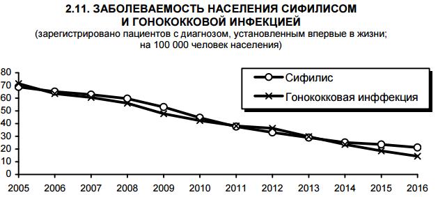 А что же в России? Согласно статистическому сборнику Здравоохранение в России за 2017 г., заболеваемость сифилисом с 2005 по 2016 г. сократилась в три раза до 31,1 на 100 тыс. населения, а гонореей - в пять раз - с 101,8 до 21,1 на 100 тыс. населения. Также в разы снизились и другие ЗППП.