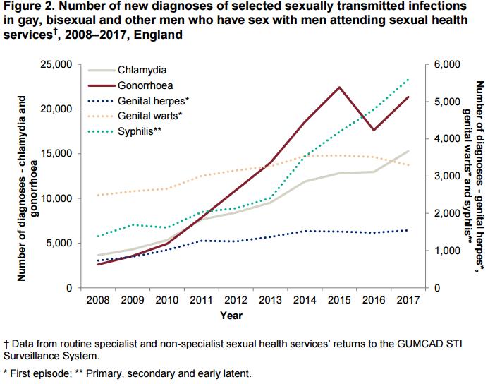 Сегодня Министерство здравоохранения Британии опубликовало доклад с обновлёнными данными по заболеваниям передающимся половым путём (ЗППП). Главной сенсацией стал рост числа новых диагнозов сифилиса в Англии - в 2017 г. зарегистрировано 7137 случаев, что на 20% больше чем в 2016 г. - 5955. Традиционно, основной группой разносчиков сифилиса являются содомиты (мужчины имеющие половые контакты с мужчинами) - на их долю приходится 78% новых случаев заболевания. Также англичан одолевает гонорея - рост за год 22%. Ниже подробности и графики ЗППП по годам.