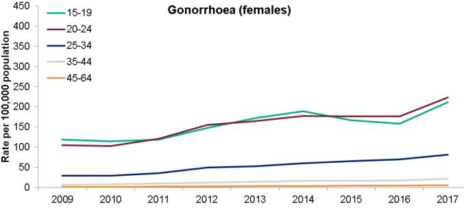 Новые диагнозы гонореи у мужчин и женщин по возрастам, Англия на 100 тыс. населения.