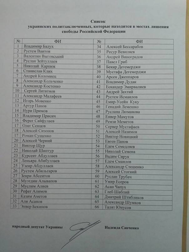 Всего в прилагаемом для помилования списке от Савченко указаны фамилии 66 украинцев.