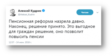 «Пенсионная реформа назрела давно. Наконец решение принято. Это выгодное для граждан решение, оно позволит повысить пенсии», - написал глава Счетной палаты Алексей Кудрин.