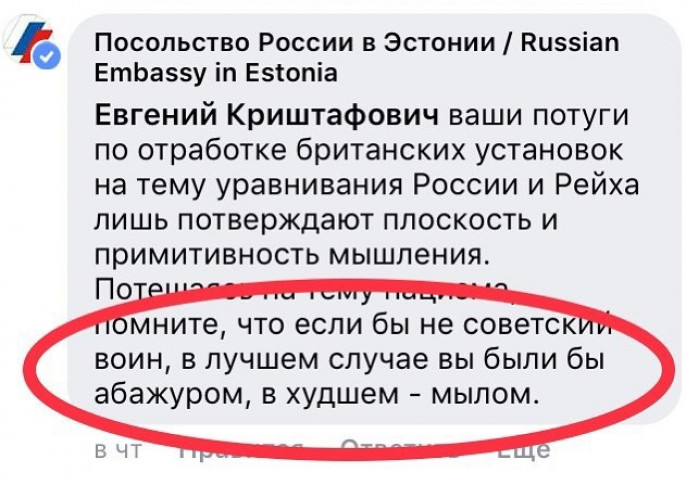 "Ваши потуги по отработке британских установок на тему уравнивания России и Рейха лишь подтверждают плоскость и примитивность мышления. Потешаясь на тему нацизма, помните, что если бы не советский воин, в лучшем случае вы были бы абажуром, в худшем – мылом", – ответило ему посольство РФ, намекая на еврейское происхождение и нестандартную сексуальную ориентацию г-на Криштафовича.