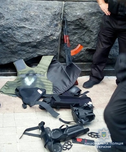 "Для проведения проверки его задержали: в ходе поверхностного осмотра у него обнаружили карабин, который визуально напоминает автомат Калашникова, а также кастеты, ножи и дымовую шашку. На место происшествия вызвали следственно-оперативную группу Печерского управления полиции, которая изъяла указанные предметы", - рассказали в полиции.