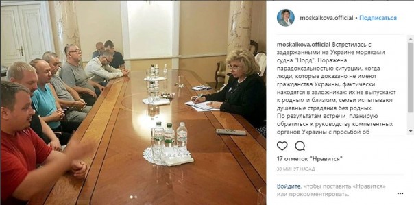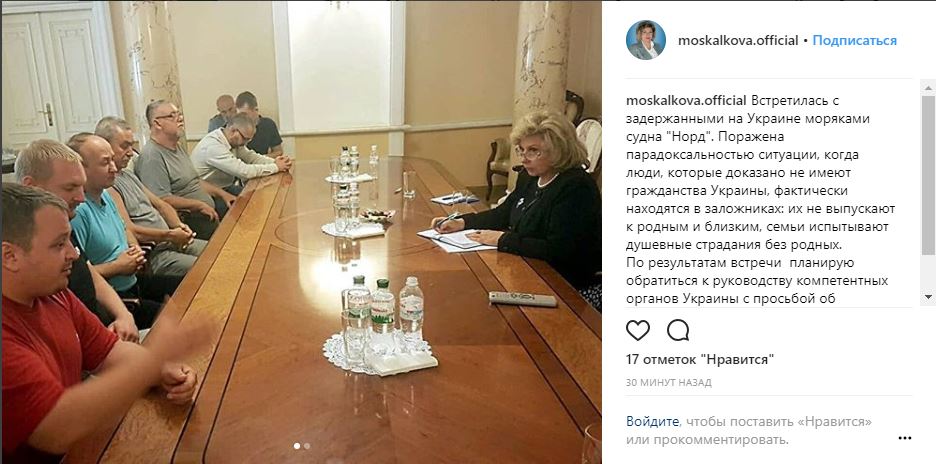 Российский омбудсмен Татьяна Москалькова, которая сегодня, 26 июня, прибыла в Киев, провела встречу с задержанными моряками судна "Норд". Об этом Москалькова написала в Instagram.