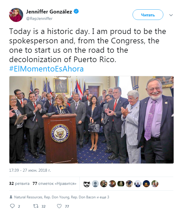 Документ был внесен представителем Пуэрто-Рико в нижней палате конгресса Дженнифер Гонсалес-Колон и еще 37 конгрессменами из Республиканской и Демократической партий.