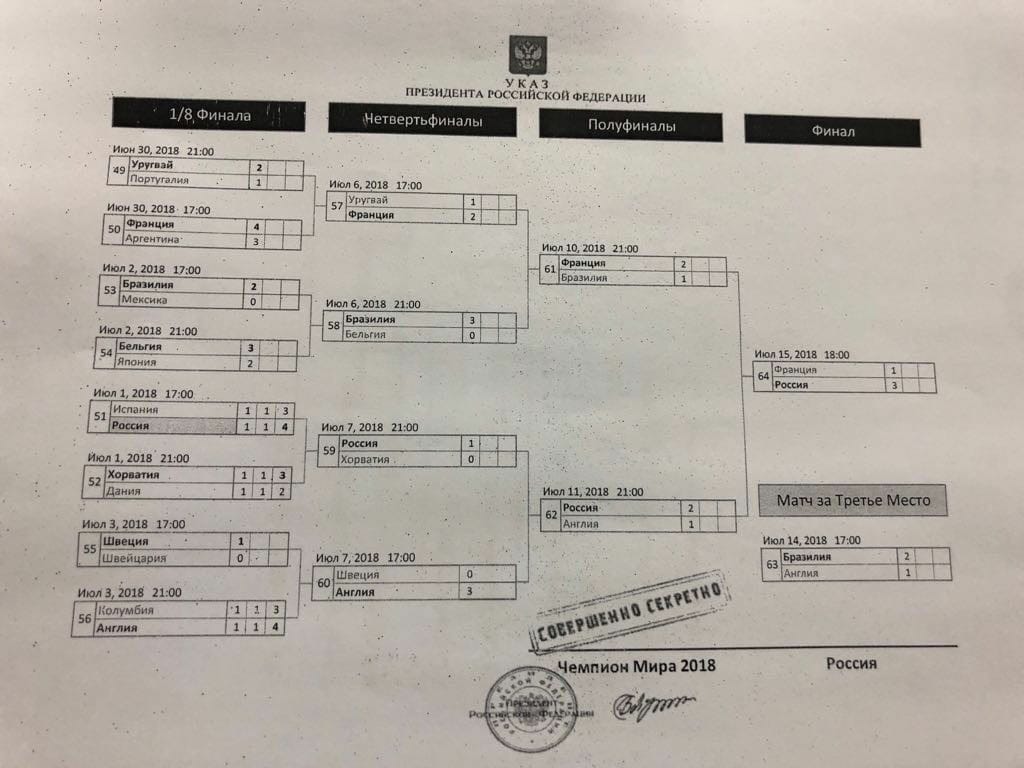 — Из 32 команд осталось только восемь. Вы — эксперты мирового класса, может быть, когда пресса уйдёт, вы со мной поделитесь, кто, по вашему мнению, станет обладателем кубка в этом году, — смеясь, сказал президент.