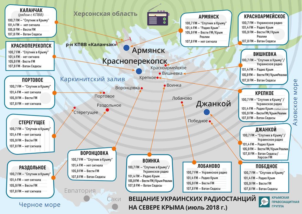 Радиовещание на Крым с новой 150-метровой украинской вышки (не так давно с помпой установленной на Чонгаре) заглушают российским сигналом. Об этом свидетельствует мониторинг Crimean Human Rights Group, проведенный в июле 2018 года.