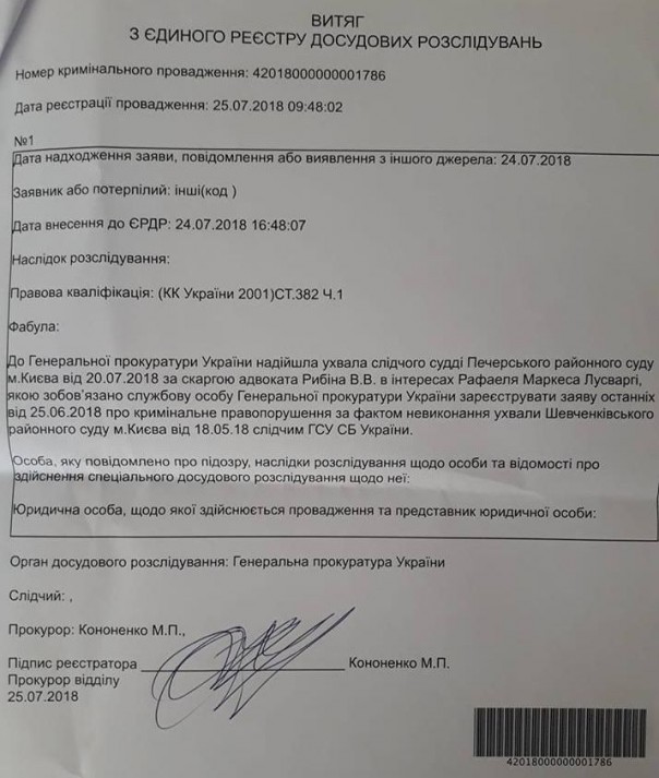 Адвокат бразильского ополченца Рафаэля Лусварги Валентин Рыбин добился возбуждения уголовного производства в отношении националистов, нападавших на него и его подзащитного, а также на следователя СБУ, который не хотел возбуждать уголовное дело по этим фактам.