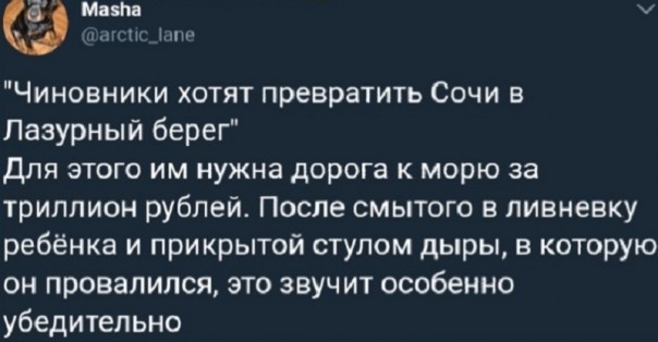Второе место. Третьего августа в поселке Лазаревское погиб ребенок. Он шел с бабушкой и упал в ливневую канаву, после чего его унесло в море. Родственница попыталась спасти внука, но не смога. Тело маленького нижнекамца обнаружили в море. Его бабушка была доставлена в больницу. Представляете? Никаких решеток, никаких защитных устройств, которые призваны препятствовать гибели местных жителей, попавших в сильный дождь, которые в данной точке Россия совсем не редкость. «Ливневые канавы по улице Октябрьской поселка Лазаревское были проложены еще в начале 1960-х годов. Они сделаны для приема дождевой воды. Это траншеи открытого типа, которые проходят с одной из сторон практически по каждой улице поселка», - уточнили в пресс-службе мэрии Сочи. То есть, никто не виноват. Ливневые канавы без защитных сооружений. Напомню, это Лазаревское, центр Лазаревского района города-курорта Сочи. Того самого Сочи, который в 2014 году принимал Олимпийские игры. Того самого Сочи, который уже в 2018 году принимал Чемпионат мира по футболу. И что, те, кто осваивал бюджеты на подготовку двух масштабных спортивных событий, не могли элементарно позаботиться о безопасности местных жителей и гостей города? А иностранцы, посетившие Олимпиаду и ЧМ-2018, видели, как в Сочи устроены ливневки, которые местная власть не замечает с 1960 года?