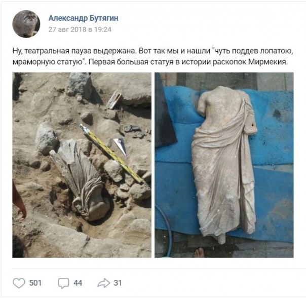 Он отметил, что это первая подобная находка на территории городища Мирмекий. Кроме того, по словам Бутягина, голову и ноги статуи отделили от остального тела ещё в древности.