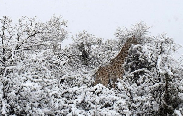 В Сети появились фото жирафов и слонов, идущих на фоне деревьев, покрытых толстым слоем снега.