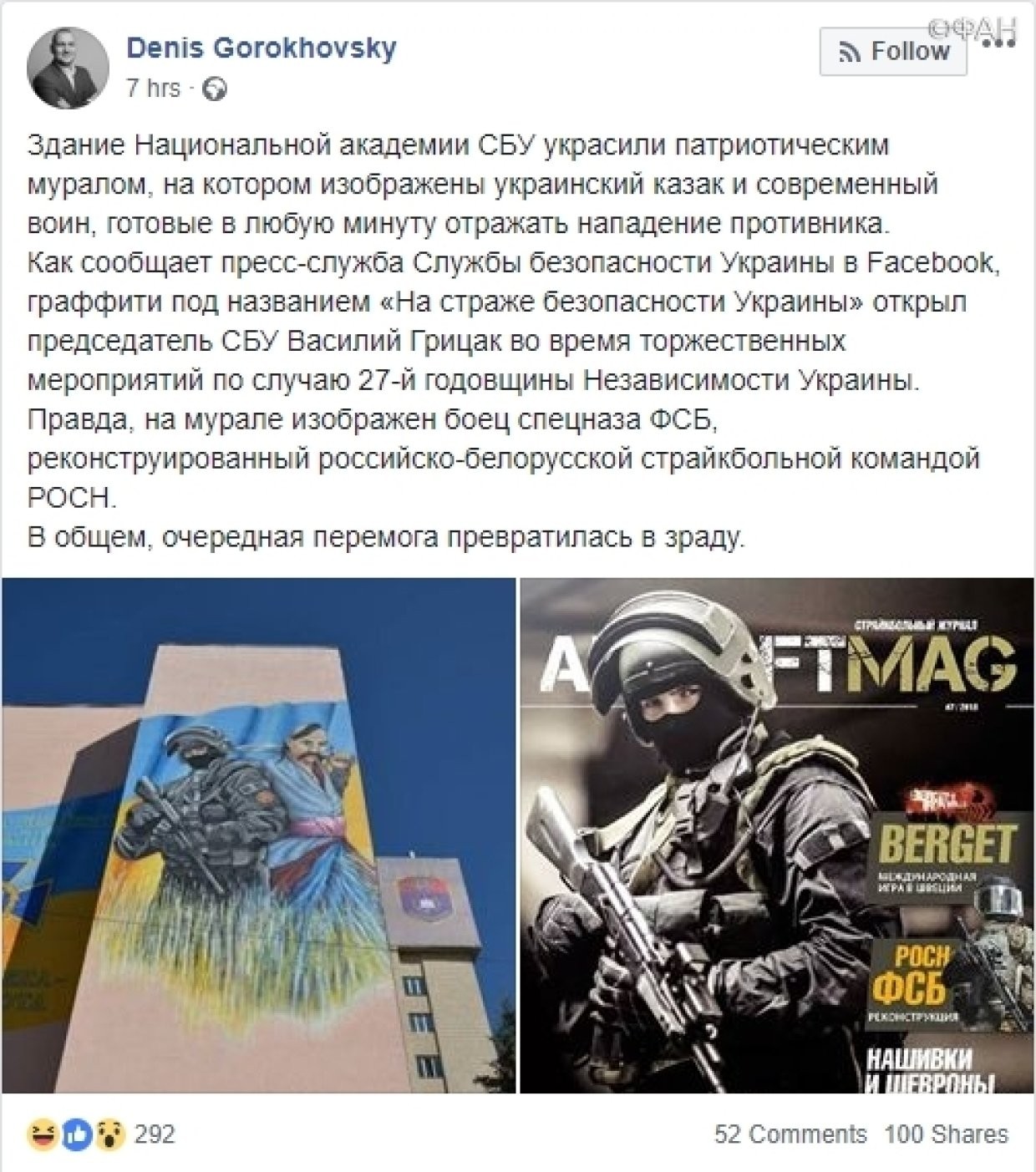 Ряд СМИ уже указал на тот факт, что фигура «спецназовца СБУ» скопирована с фотографии на обложке страйкбольного журнала AirsoftMag, на которой изображен один из участников белорусской команды РОСН в форме сотрудника спецназа ФСБ. Также об этом написал пользователь Facebook Денис Гороховский, отметивший сходство фигуры на граффити и спортсмена на обложке журнала.