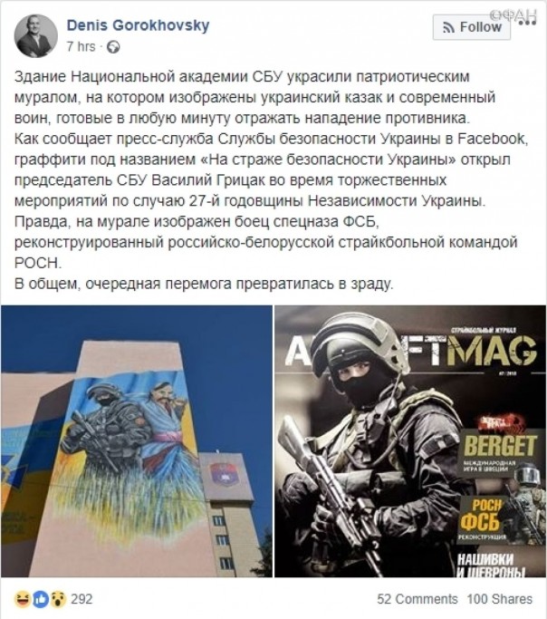 «Воин-казак и воин-спецназовец бок о бок изображены на этом мурале (граффити — Прим. ФАН)», — заявил Грицак.