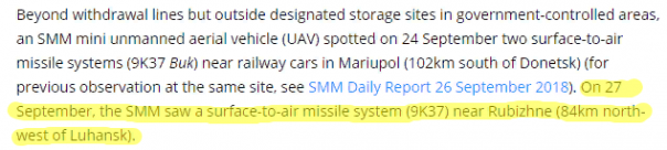 Там указали, что три зенитно-ракетных комплекса (9K37) обнаружили на железнодорожной станции в подконтрольном Киеву городе Рубежное 28 сентября.
