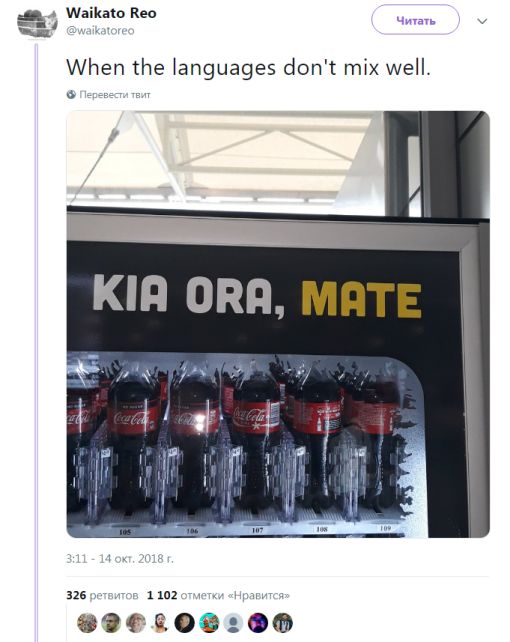 Попытка компании Coca-Cola совместить английский язык с языком маори (один из трех государственных языков Новой Зеландии) привела к неприятным последствиям. На торговом автомате с газировкой в Новой Зеландии случайно написали «Здравствуй, смерть» вместо «Здравствуй, приятель». Об этом в понедельник, 15 октября, пишет газета The Guardian.