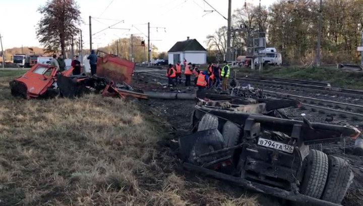 Отмечается, что водитель грузовика выехал на переезд перед приближающимся поездом, следовавшим из Минска в Адлер.