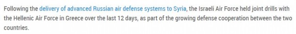 Казалось бы, акцентируя общее внимание на растущем сотрудничестве Израиля с Грецией в сфере обороны, автор статьи как бы вскользь напоминает читателю о том, что на территории Сирии уже располагаются российские С-300, угрожающие безопасности израильтян.