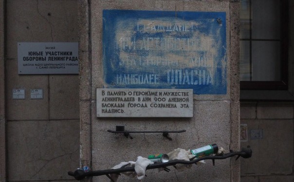 Предупреждение об опасности при артобстреле, оставленное на 14-м доме по Невскому проспекту в память о погибших во время блокады Ленинграда, второй раз за неделю приходится оттирать от краски. Директор ближайшей школы обратилась в полицию.