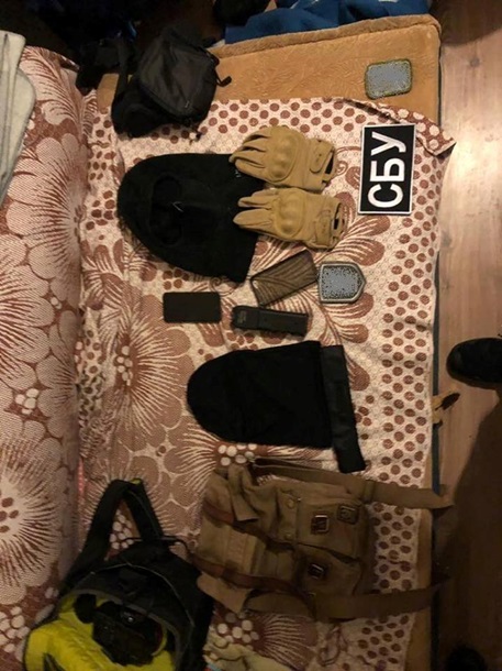 Во время одновременных обысков по адресам фигурантов обнаружены спецодежда, шевроны СБУ, поддельные удостоверения различных правоохранительных органов, оружие, боеприпасы к нему, ножи, маскировочная одежда, балаклавы, рации и множество государственных номерных знаков, которые использовали во время разбойных нападений.
