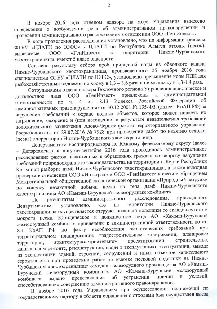 По результатам административного расследования, проведённого департаментом Росприроднадзора по ЮФО, осенью 2016 года были установлены нарушения экологических требований при проведении работ по выемке песчаной подсыпки на Нижне-Чурбашском хвостохранилище отходов железорудного производства.