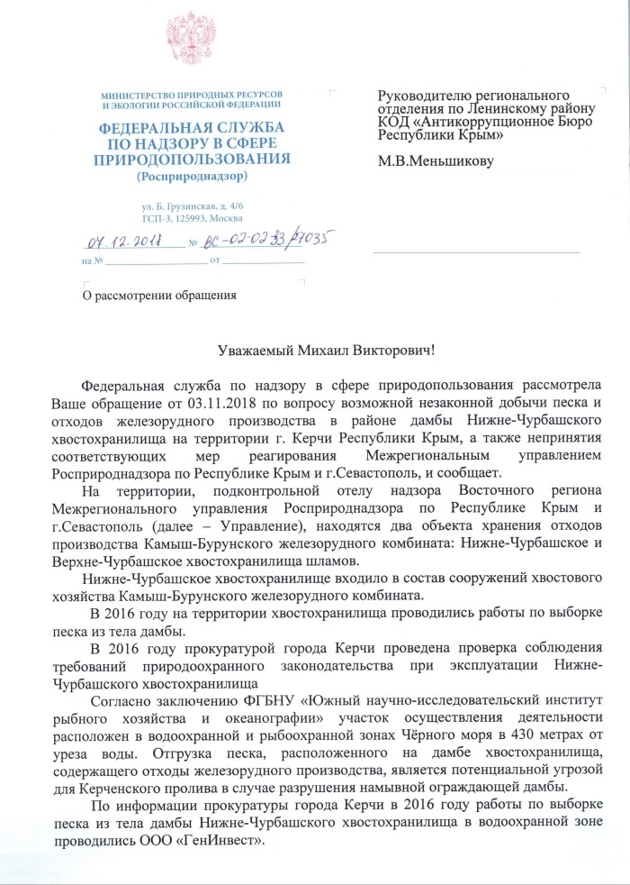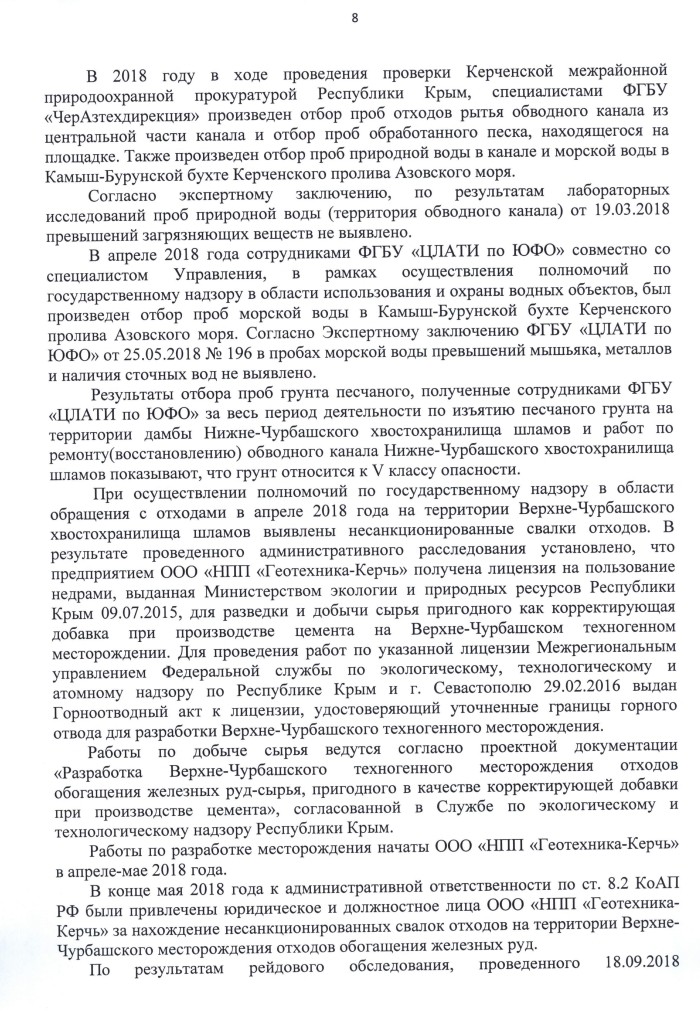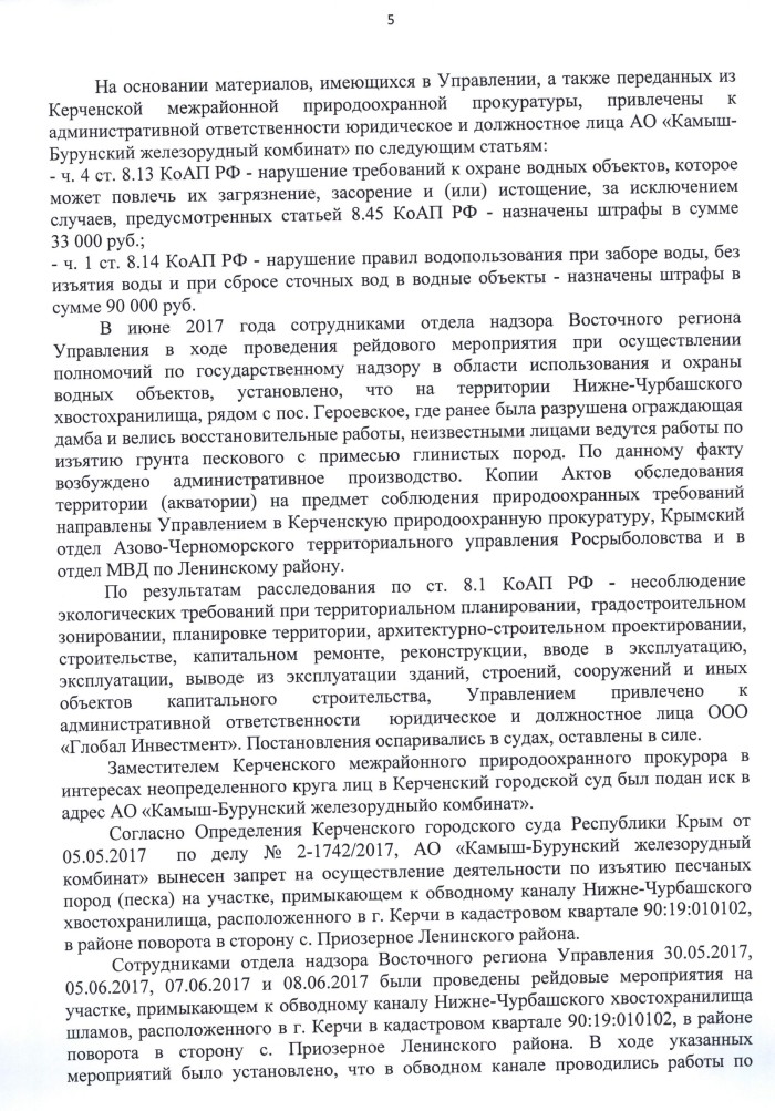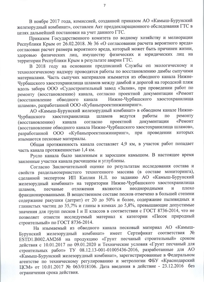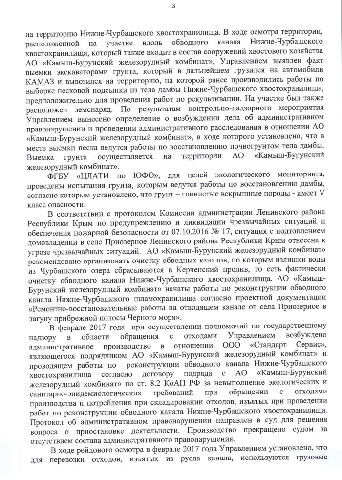 В ходе прокурорских проверок и рейдов Крымского управления Ростехнадзора в 2016 году были установлены следующие обстоятельства: ликвидатор АО «Камыш-Бурунский железорудный комбинат» приступил к выемке песка из тела дамбы Нижне-Чурбашского хвостохранилища, не имея разрешения на вывод ГТС из эксплуатации.