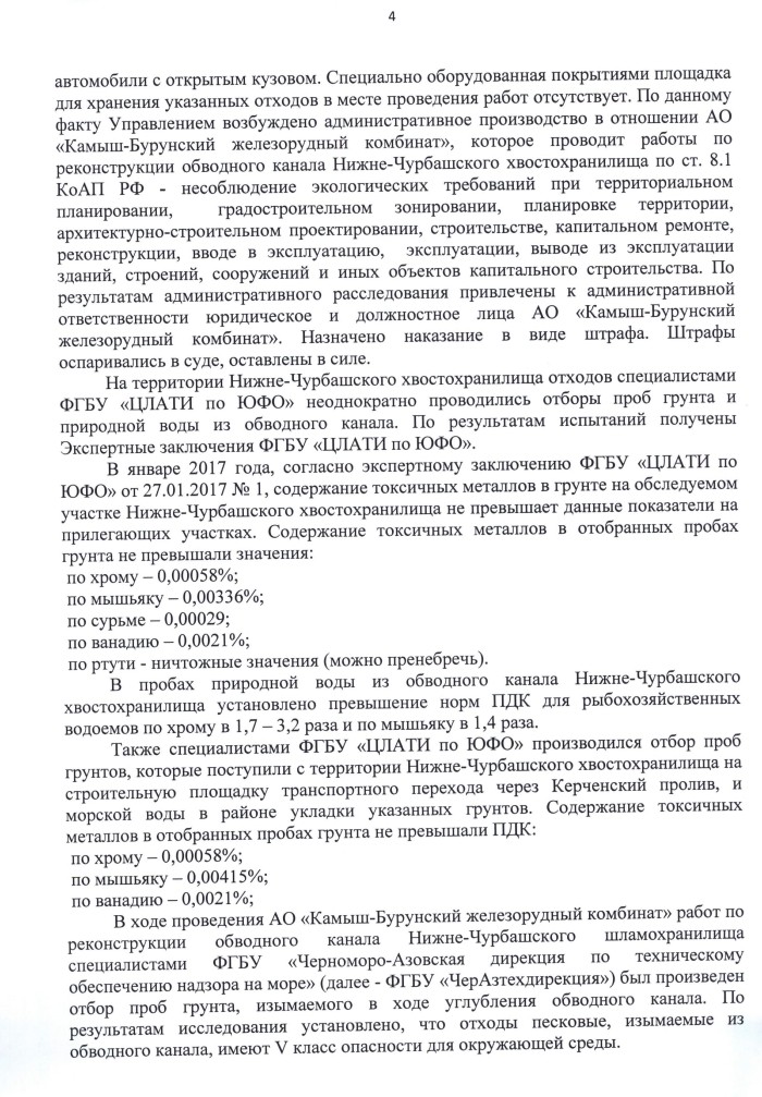Согласно заключения ФГБНУ «Южный научно-исследовательский институт рыбного хозяйства и океанографии», работы по извлечению песка из дамбы производились в водоохранной и рыбоохранной зонах Азовского моря. Установлено, что отгрузка песка из дамбы хвостохранилища, содержащего отходы железорудного производства, является потенциальной угрозой для Керченского пролива в случае разрушения ограждающей дамбы.