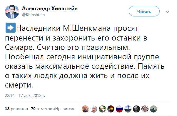 По словам Хинштейна, родные просят захоронить останки Шенкмана в Самаре.