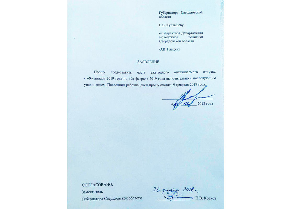 Кроме того, снимок заявления Глацких опубликовал блогер Сергей Колясников в "Живом журнале".