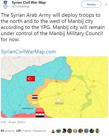 Ранее представитель генштаба вооруженных сил республики сообщил, что сирийские войска установили контроль над городом Манбидж и подняли над ним сирийский национальный флаг.