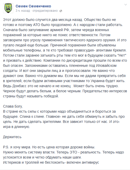 «Нужно менять систему власти. Теперь ЭТО — реальность. Теперь надо успокоиться всем и четко обдумать наши шаги. В стране есть силы с которыми надо объединяться и бороться за будущее. Спина к спине», — заявил Семен Семенченко на своей странице в Facebook.