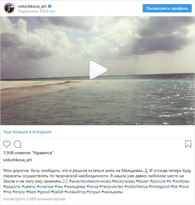 Балерина Анастасия Волочкова решила эмигрировать на Мальдивы и остаться там на постоянное место жительства. Так, на своей странице в Instagram бывшая прима Мариинского, а затем и Большого театров написала: "Я нашла уже давно любимое место на Земле и не могу ему изменять".