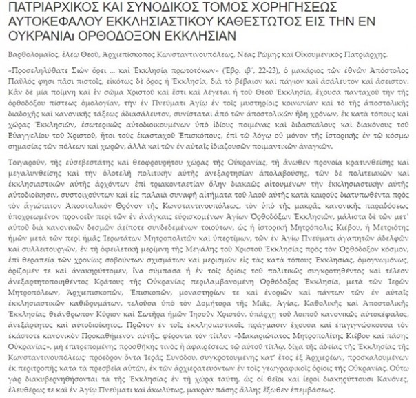 Вселенский патриархат в Стамбуле официально опубликовал текст томоса о предоставлении автокефалии новой украинской церкви на трех языках: английском, греческом и украинском.