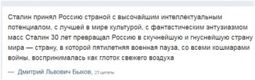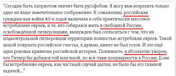 Гитлер-то, дескать, освободителем был, а мы его не поняли. Вот только в еврейском вопросе фюрер ошибся. Если бы не истребление евреев, приняли бы его в Советской России с распростёртыми объятиями. Понимаете исторический и человеческий уровень Быкова?!