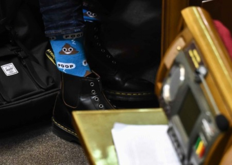 На ногах депутата видны голубые носки с соответствующим изображением фекалий и надписью Poop. В сетях активно комментируют образ народного избранника.