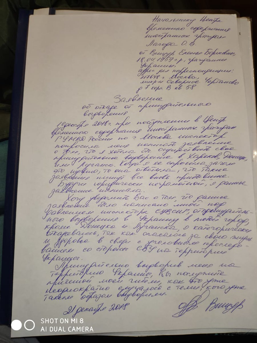 10 декабря 2018г при поступлении в Центр времени ного содержания иностранных граждан ГУМВД России по г. Москве инспектор попросила меня написать заявление о том, что я хотела бы осуществить свое принудительное выдворение в Харьков, Донецк или Луганск. Когда я спросила, зачем это нужно, то она ответила, что такие заявления пишут все вновь прибывшие. Будучи юридически неграмотной, я данное заявление написала.