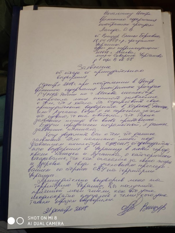 Хочу уведомить вас о том, что данное заявление было написано мной под давлением инспектора СУВСИГ, от принудительного выдворения в Украину в любой город, кроме Донецка и Луганска, я категорически отказываюсь, так как опасаюсь за свою жизнь и здоровье в связи с уголовным преследованием со стороны СБУ на территории Украины.
