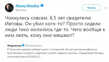 При всех своих русофобских заявлениях Навальный не забывает разбавлять инфополе защитой «Свидетелей Иеговы» по любому удобному поводу.