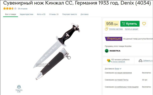 Реплика кинжала войск нацистской Германии 1933 года продается в одном из интернет-магазинов Украины. Его цена - почти тысяча гривен.