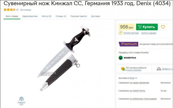 В одном из крупнейших интернет-магазинов Украины продается сувенирный нож войск нацистской Германии.