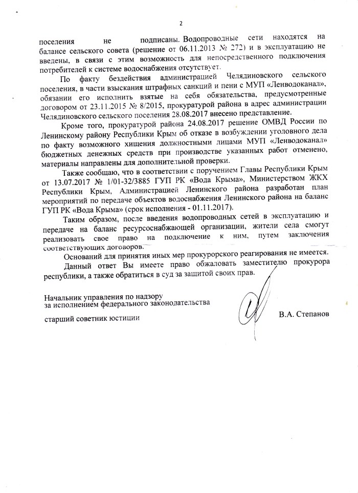 По данным прокуратуры и министерства ЖКХ Крыма, принять в эксплуатацию новую «закольцовку» можно только вместе с разводящими сетями кооператива «Родник». Между тем, проектом по капитальному ремонту водопроводных сетей не предусматривалось подключение к сети абонентов, не являющихся членами ПК «Родник».