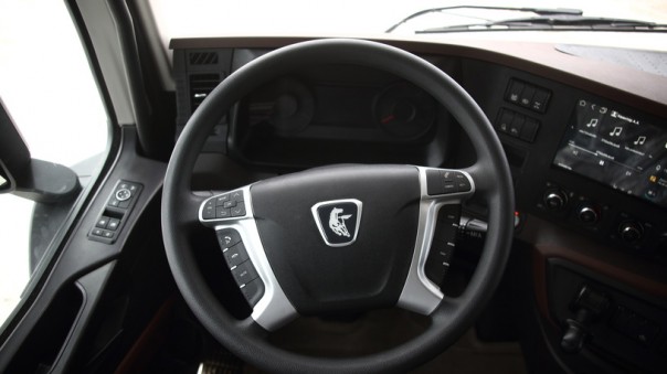 Новый грузовик комплектуется и новой кабиной с обозначением К5, высота салона которой от пола до потолка составляет 1 980 мм, а ширина – 2 270 мм. На заводе утверждают, что разрабатывалась она с упором на комфорт водителя: к примеру, пол в кабине сделан ровным, без моторного тоннеля, а водительское кресло на пневмоподушке снабжено необходимыми регулировками. Помимо новой панели приборов и мультифункционального руля рабочее место водителя оснащается еще и мультимедийной системой с 10-дюймовым сенсорным монитором, сама же кабина, помимо спального места, получила еще и множество отсеков для хранения вещей.