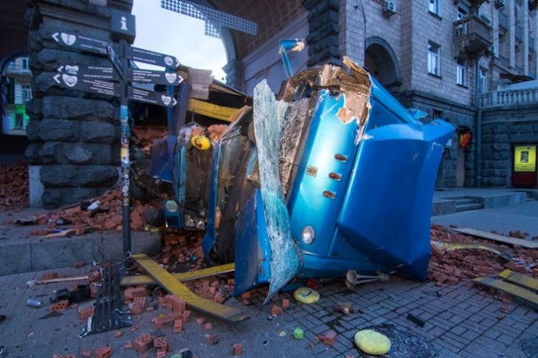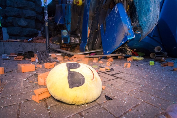 На пути своего движения Renault протаранил Toyota, снес дорожный знак и ситилайт. А в конце грузовик скатился по ступеням в арку и вылетел на Крещатик. Кабина грузовика перевернулась и была сдавлена весом кирпичей, которые высыпались из прицепа.