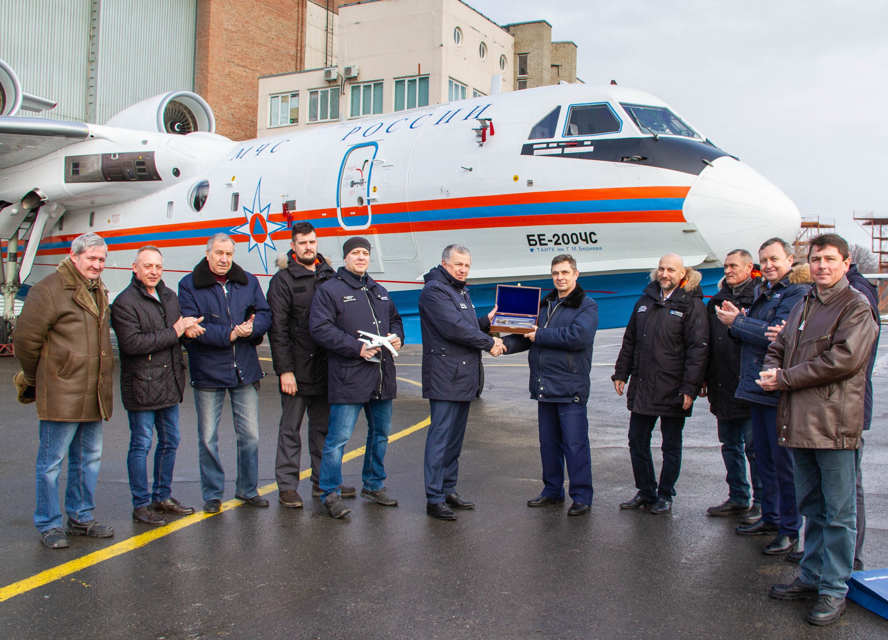 Церемония передачи МЧС России шестого и последнего серийного самолета-амфибии Бе-200ЧС (серийный номер 03-08, регистрационный номер RF-31390) производства ПАО «Таганрогский авиационный научно-технический комплекс имени Г.М. Бериева» по контракту 2011 года. Таганрог, 27.02.2019 (с) ПАО «Объединенная авиастроительная корпорация» Источник