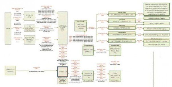 "В течение нескольких дней 38,2 млн долларов США были выведены из Укртранснафты на счета компании Transit SA в Кипрском филиале Банка, зарегистрированной в Швейцарии на Игоря Коломойского (32,5%), Геннадия Боголюбова (32,5%) и Игоря Суркиса ( 25%)", – заявляет Арьев.