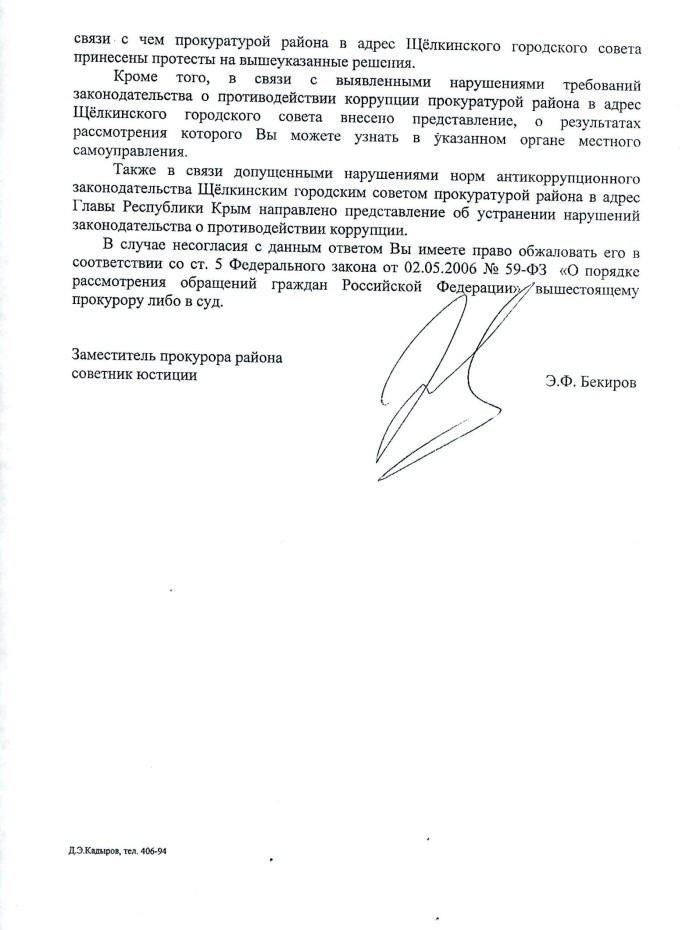 По результатам второй проверки прокуратура вынесла протест на решение Щёлкинского городского совета и направила представление на имя главы правительства Крыма о совершении коррупционного преступления Владимиром Загребельским. Данное представление находится на рассмотрении главы региона. Кроме того, в принятых ранее решениях сотрудники надзорного ведомства подозревают Сергея Варавина в превышении полномочий.