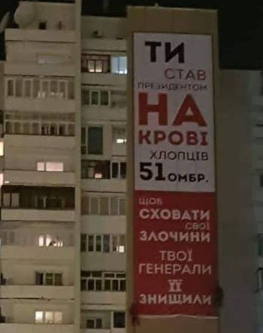 «Ты стал президентом на крови. Ребята 51 ОМБр. Чтобы скрыть свои преступления, твои генералы её уничтожили. Волынь такого не прощает», – написано на баннере.