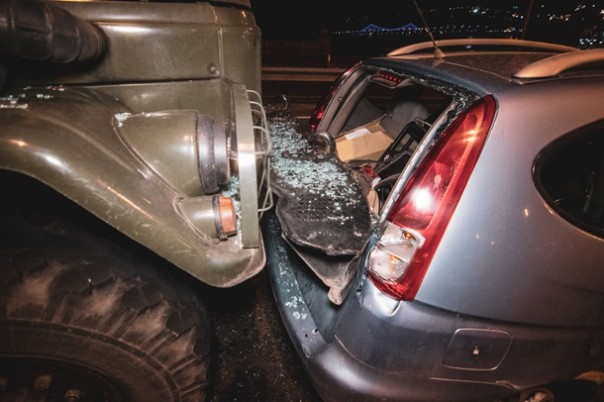 По данным очевидцев, Chevrolet двигался по средней полосе. Сзади в "легковушку" влетел военный грузовик. По предварительной информации, причиной столкновения стали неисправные тормоза в грузовом авто. У Chevrolet вылетело заднее стекло. Также значительная часть машины смята. К счастью, в результате аварии никто не пострадал. На помощь грузовику прибыл второй военный автомобиль.