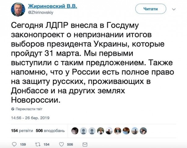 В Госдуму внесён законопроект о непризнании итогов выборов президента Украины. Инициатором выступила партия ЛДПР Владимира Жириновского.