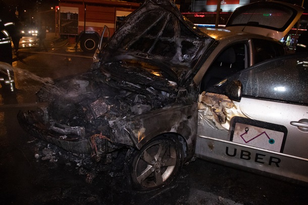 В Киеве на Дарницкой площади в ночь на 14 апреля произошло ДТП с возгоранием. Столкнулись автомобиль Mazda 3, службы такси Uber, и Hyundai Elantra. Огонь повредил оба автомобиля.