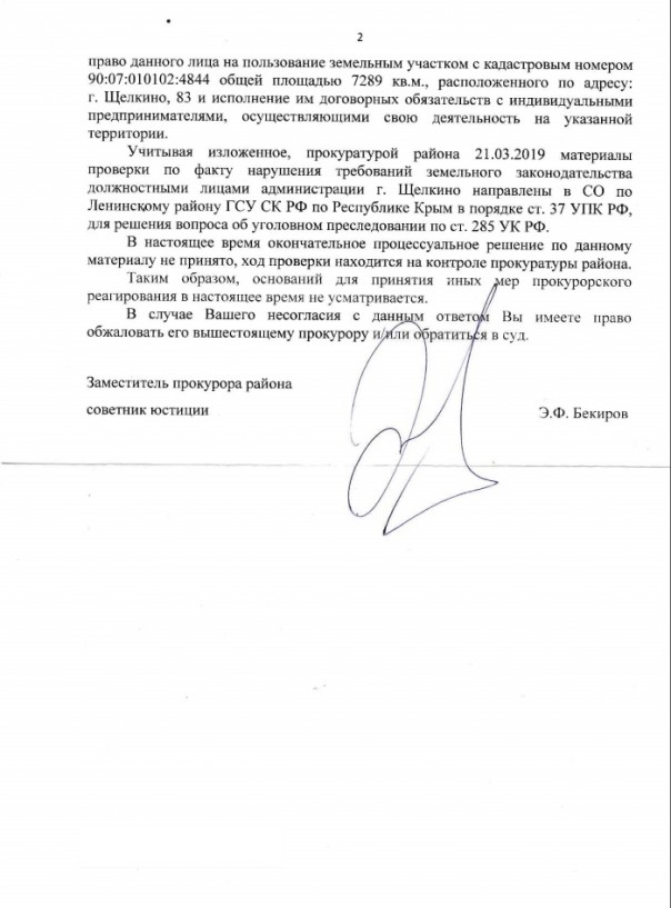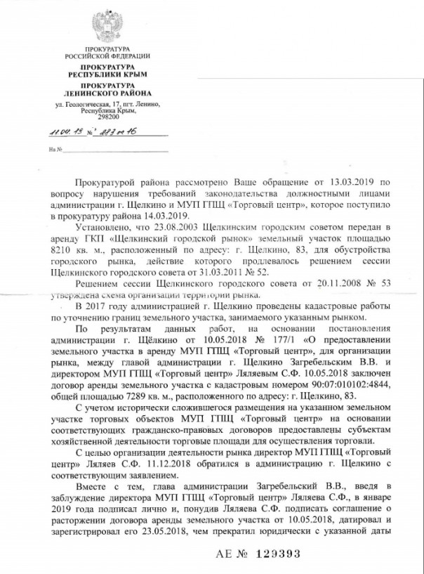 Вместе с тем в январе 2019 года по инициативе Владимира Загребельского действующий договор аренды земельного участка был расторгнут. В ответе прокуратуры сообщается о том, что глава администрации Загребельский лично подписал соглашение о расторжении договора и, введя в заблуждение директора МУП городского поселения Щёлкино «Торговый центр» Сергея Ляляева, принудил последнего подписать соглашение, датировав его «задним числом» от 23.05.2018 года.